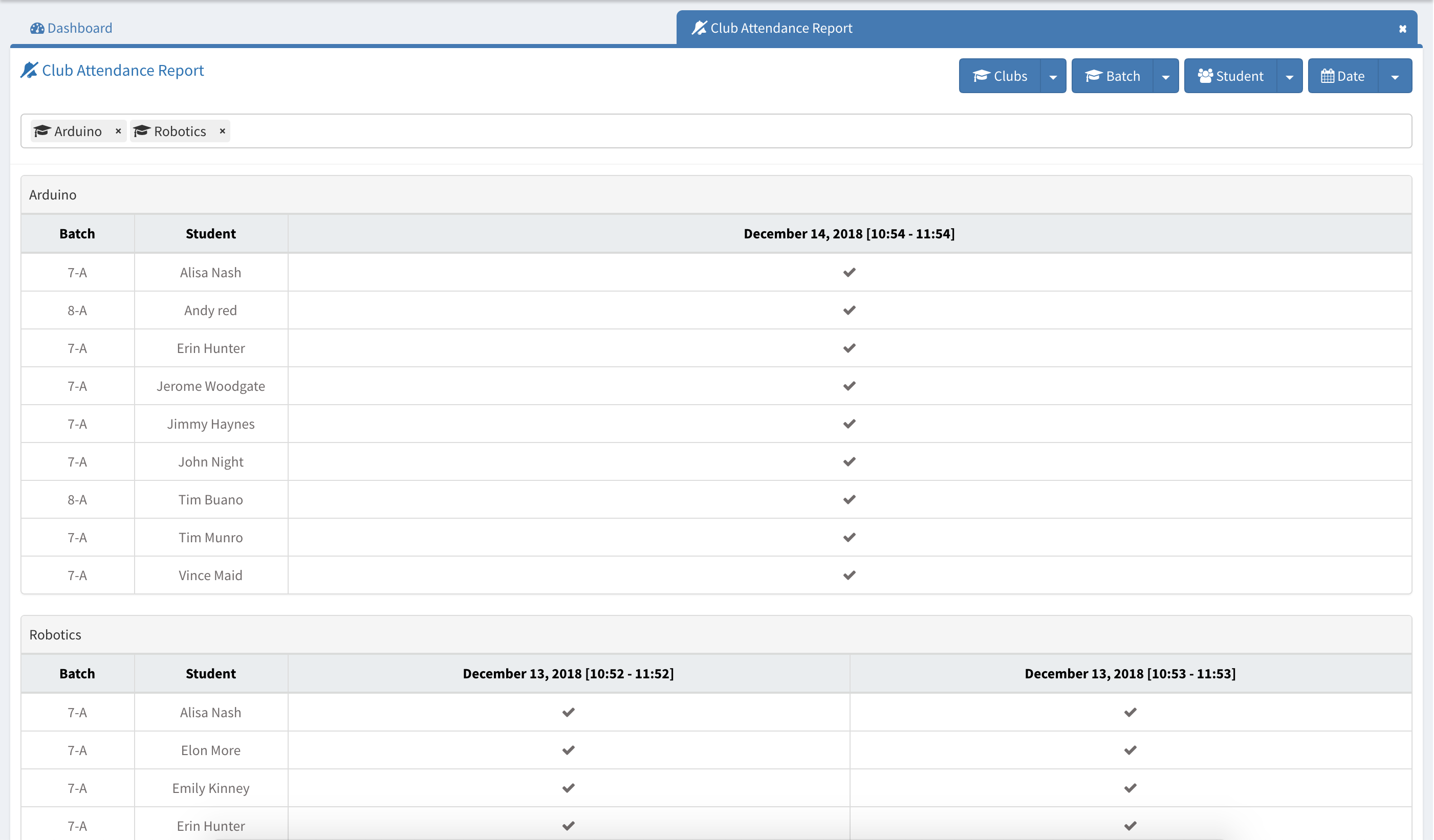 Club attendance reports can be accessed within this report to show the batches attendance performances on school clubs.