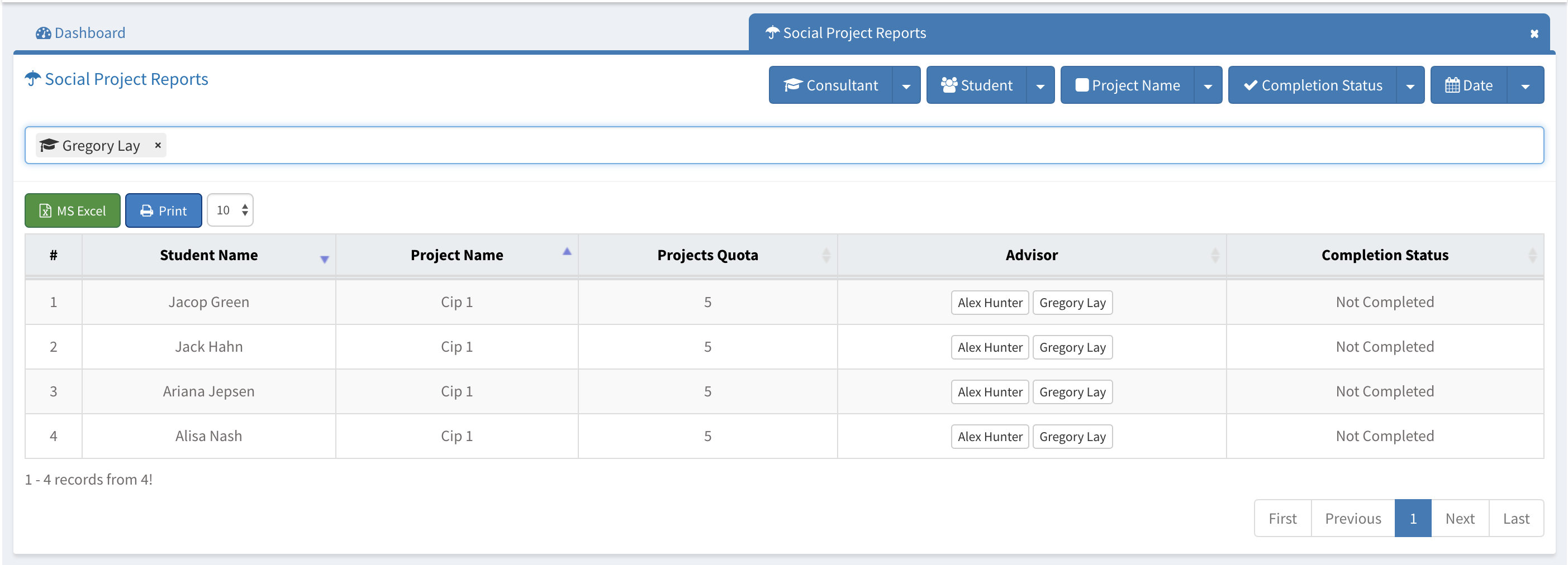 Social projects report gives detailed picture to administrators on the students status of the given social project.