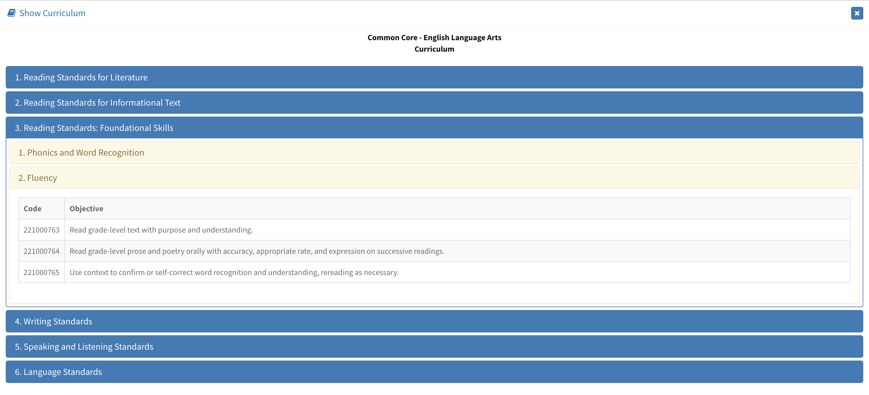 To reach the details of the curriculums, simply click the classes name marked under "Common Core"