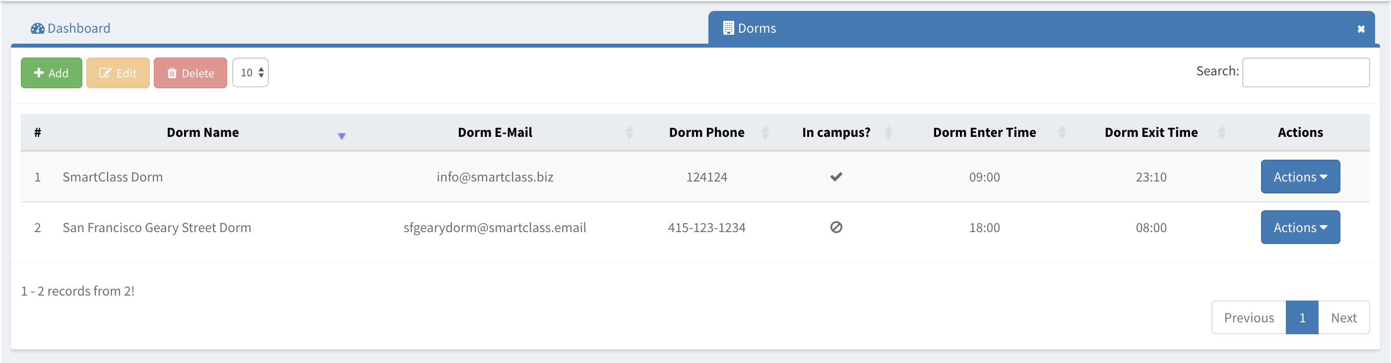 You can customize your dorms entrance and exit times by grades. To add the details by class, click on Actions button located on the right side of the dorm you would like to add the times in and click "Entrance & Exit Hours"