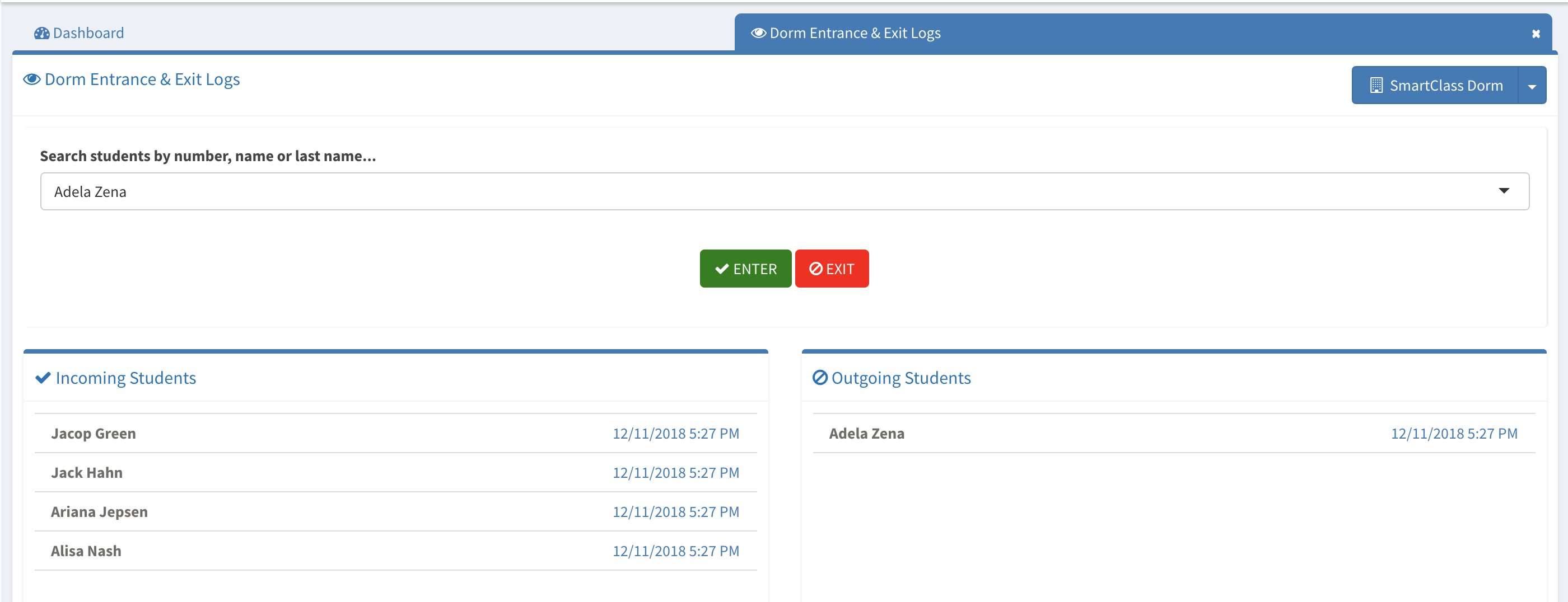 In entrance and exit logs, the dorm personnel can log students by their entrance and exits by selecting the dorm and choosing their name.