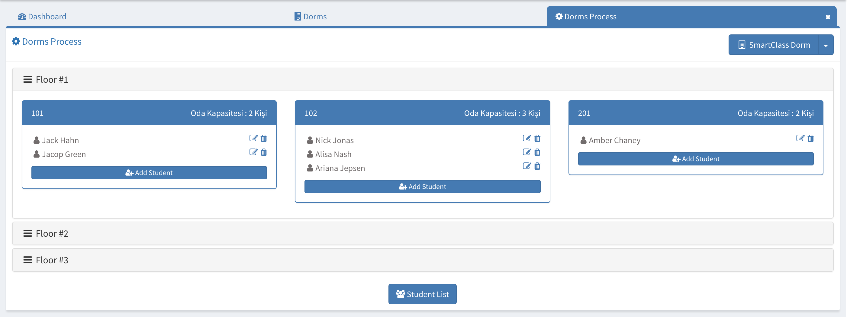You can access the complete student list in the selected dorm by just clicking "Student List" button located at the bottom center of the page.