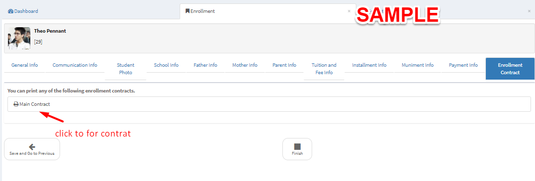 Upon clicking on the "Main Contract" button, you can access various information completed on the previous steps and schools contract informations with final approvals from school officials, parent and student.