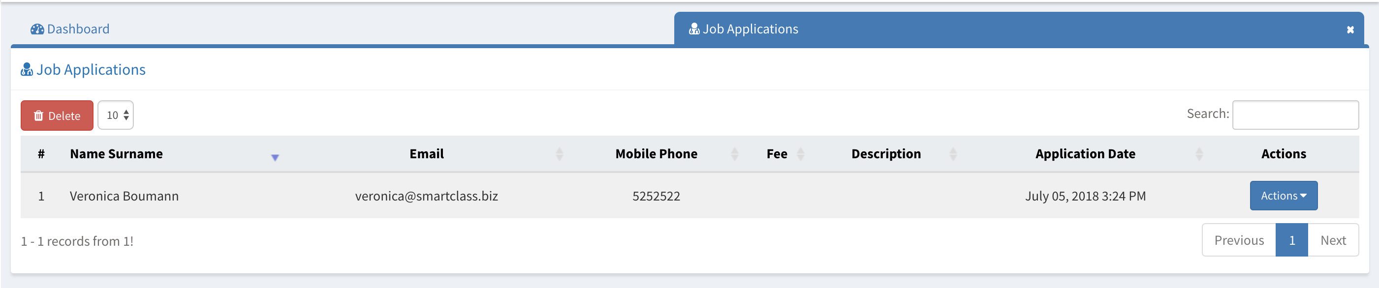 When you connect SmarClass Job Applications to your website, the applicants will be collected in here and you can see their details be clicking Actions button.