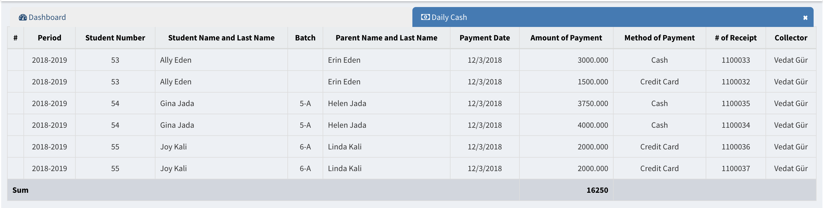 The menu is updated with the tuition payments no matter they have been paid cash, credit, debit or check.