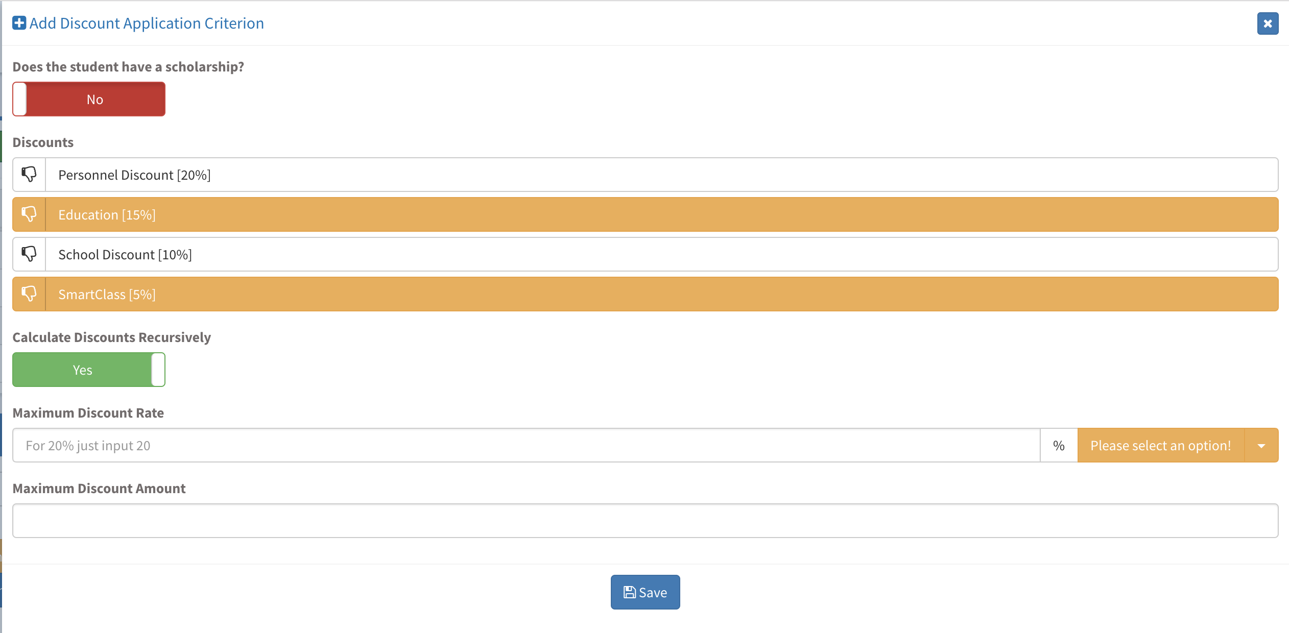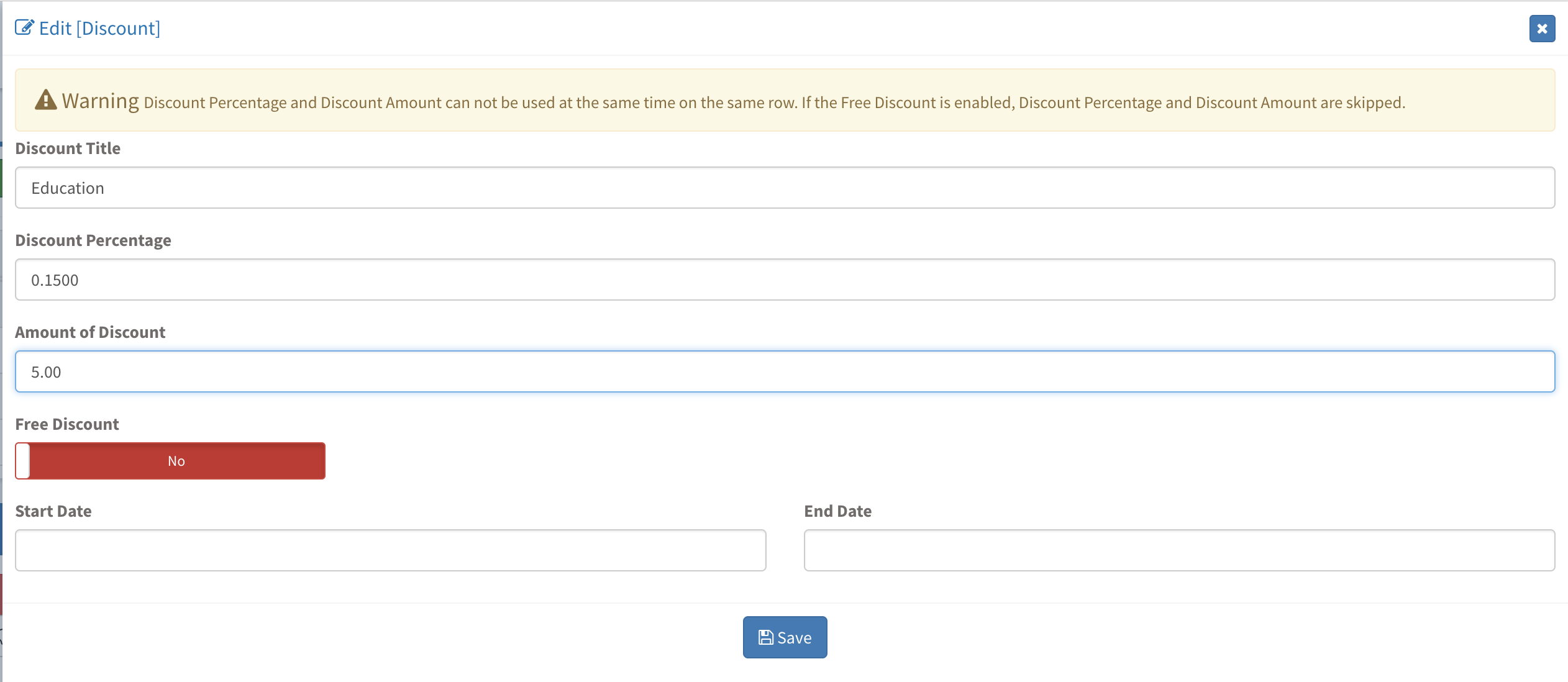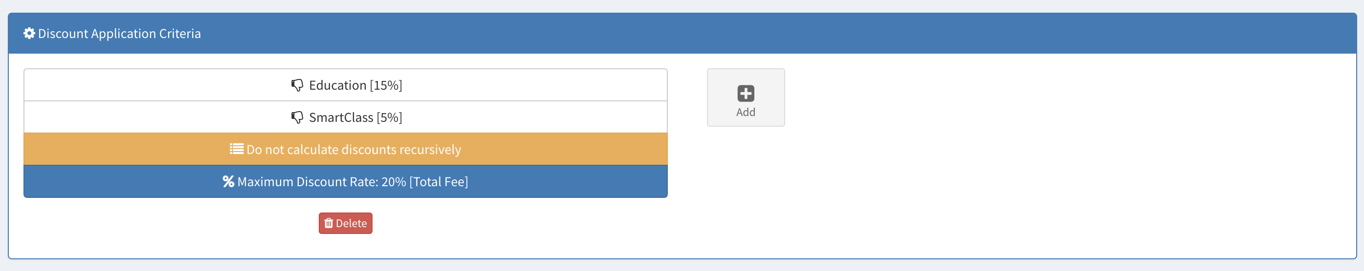 In the discounts page, you can setup your schools discount structures and discount application criteria.