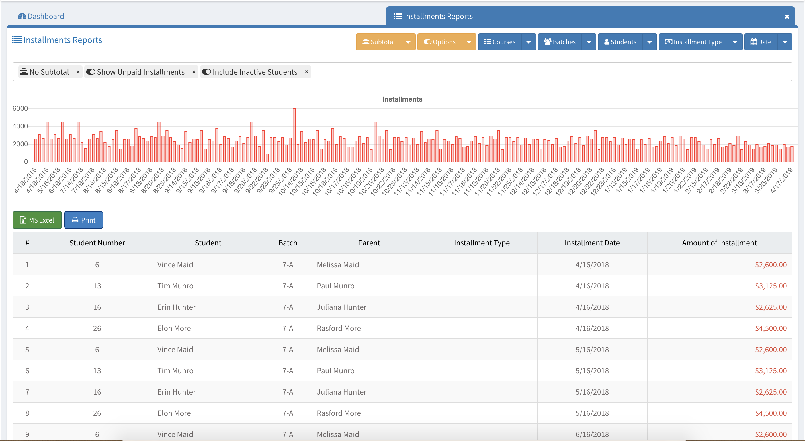 - Options ( Show Without Details - Include Inactive Students - Show Unpaid Installments )