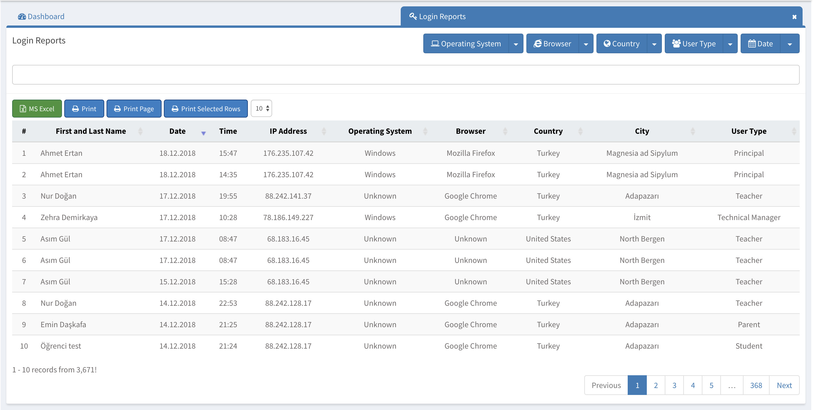 The reports can also be filtered to single user by using the search filter and can be exported/printed using the buttons located top middle section of the page.