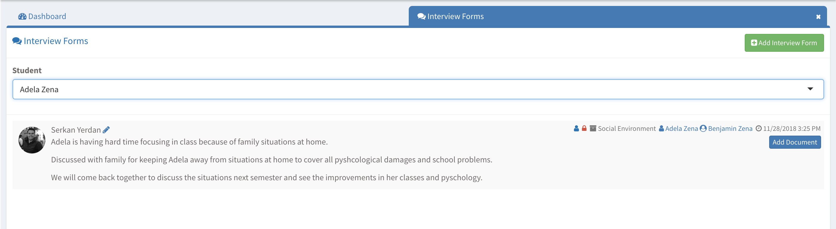 - Select the student whom you would like to add interview notes on