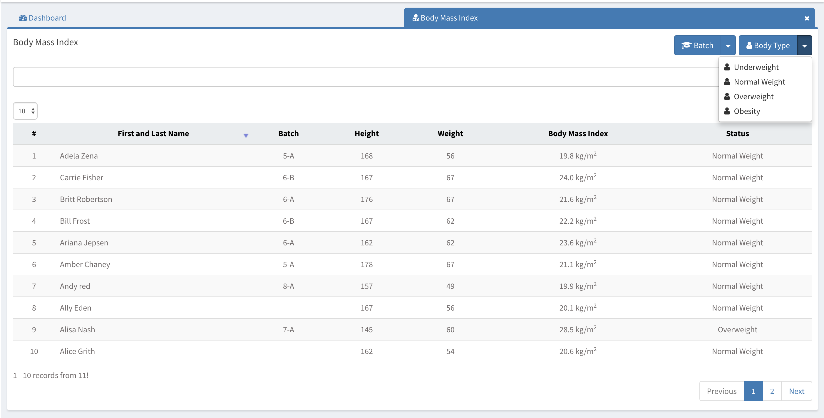 Body Mass Index can be filtered by student, batch or body type as shown in the screenshot above.