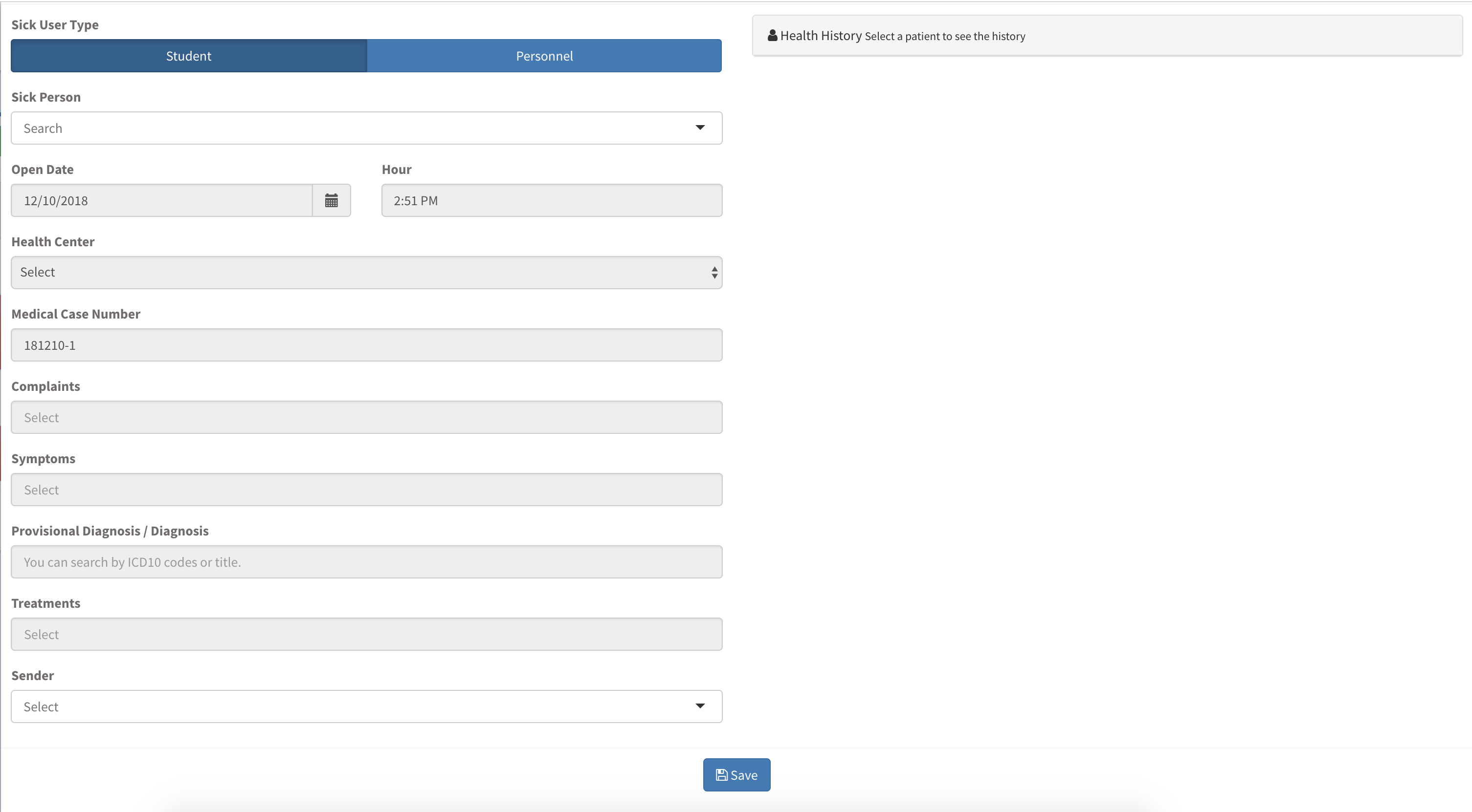 You can choose between adding a medical case for a student of school personnel. After choosing the student/personnel SmartClass will automatically bring their patient history and important information.