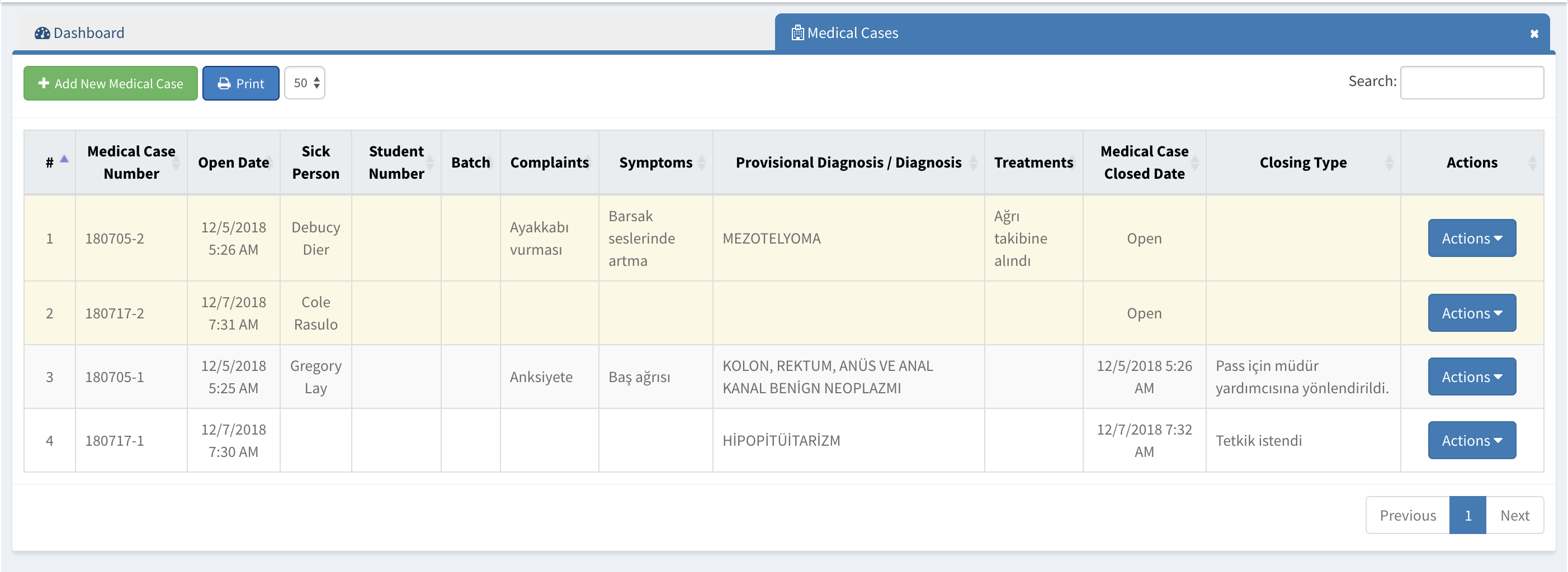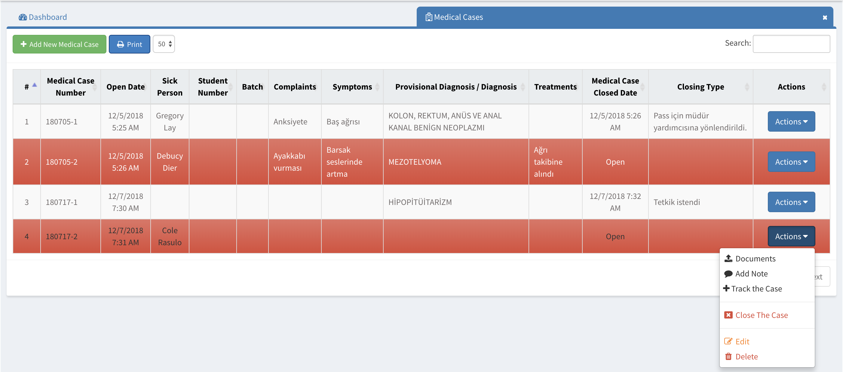 In Medical Cases, you can track the student ongoing treatments as well as open a new one.