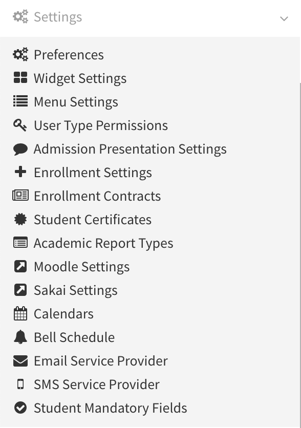 Important Note : Some of the settings menus differentiate within Schools and Headquarters. Those are marked in the descriptions below.