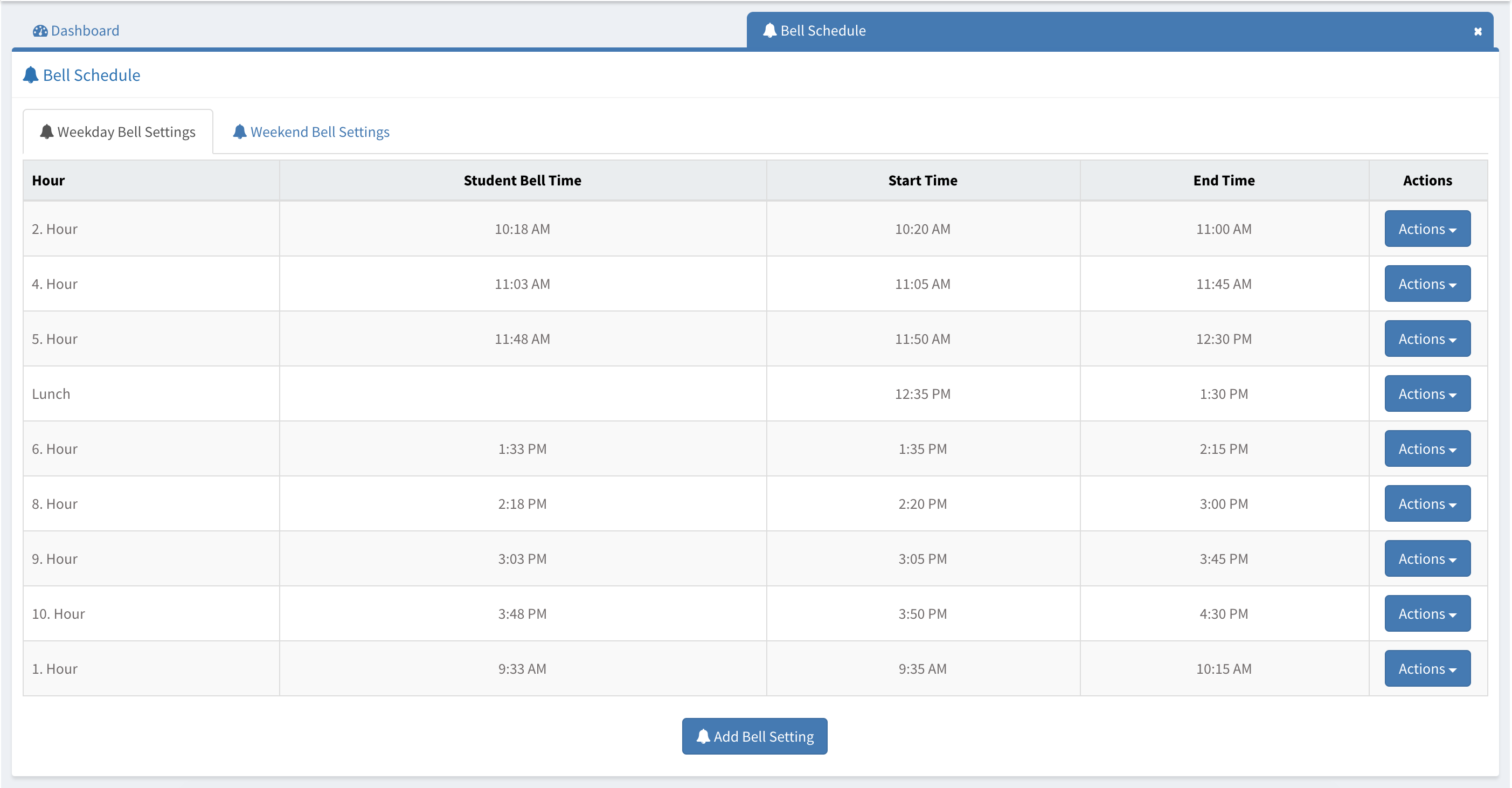 You can customize the bell schedules for the weekdays and for the weekends and add custom bell times for extra curricular activities to book readings.