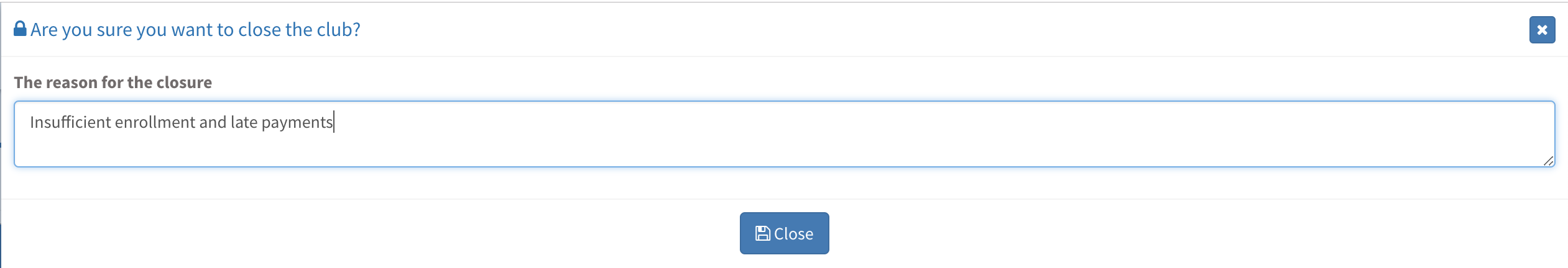 You can close a club by clicking the lock button the club square and type in the reason for closure.