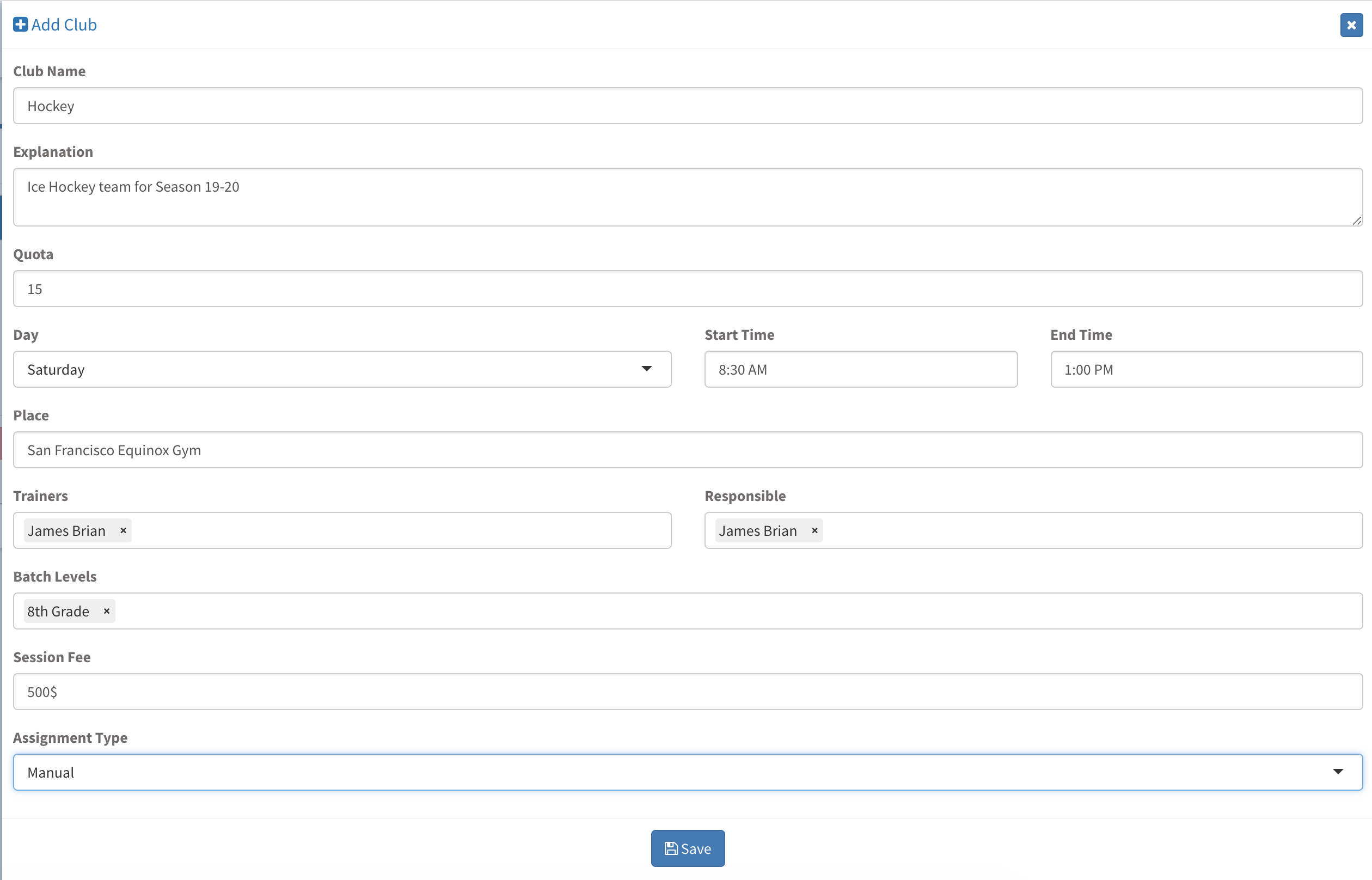You can create various number of clubs and assign trainers to students, provide with sessions plans to transfer payment operations to finance department for collection.