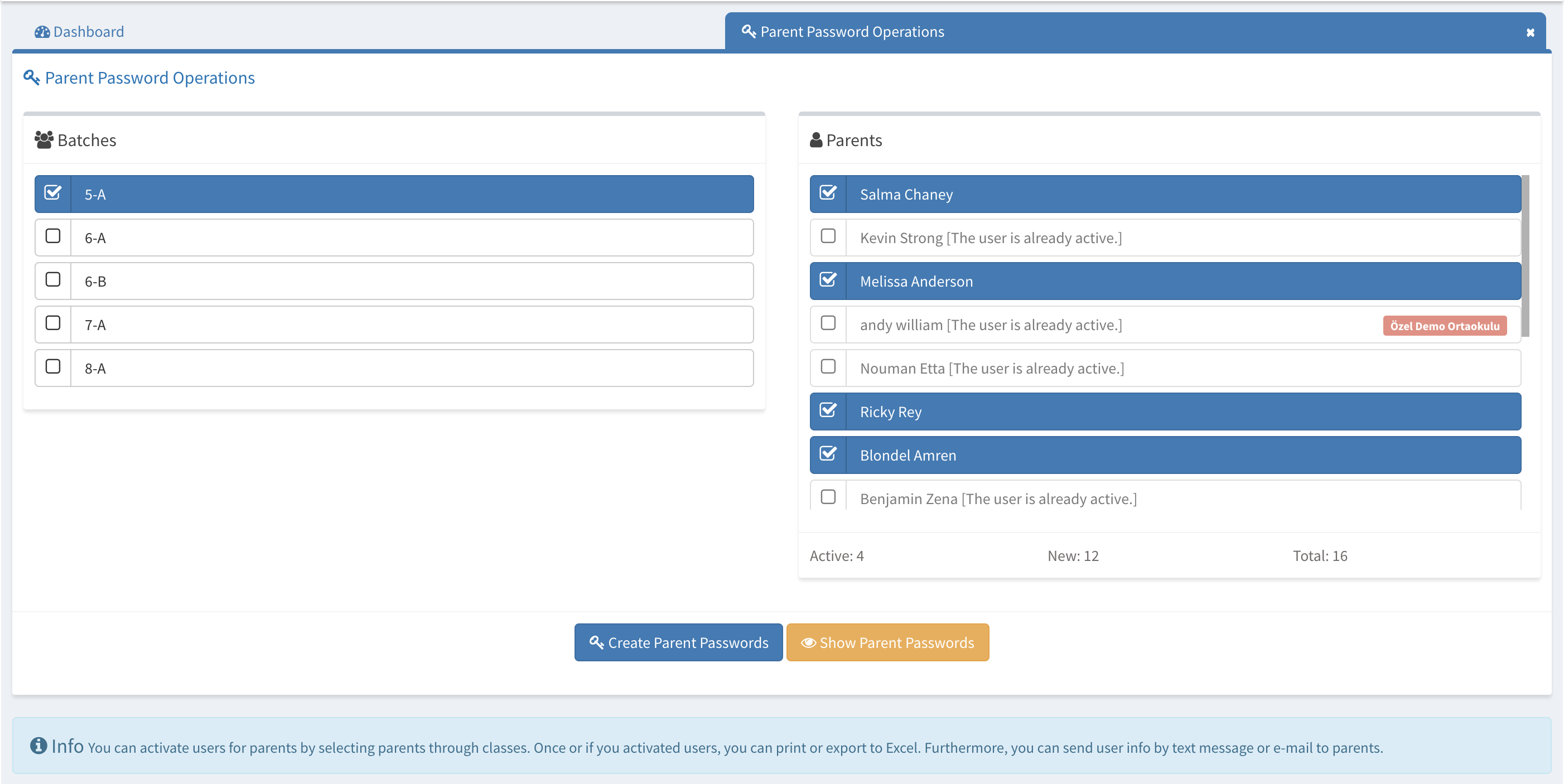 You can send SMS or Email notifications to the parents about their password information or create .PDF files for their password tickets.