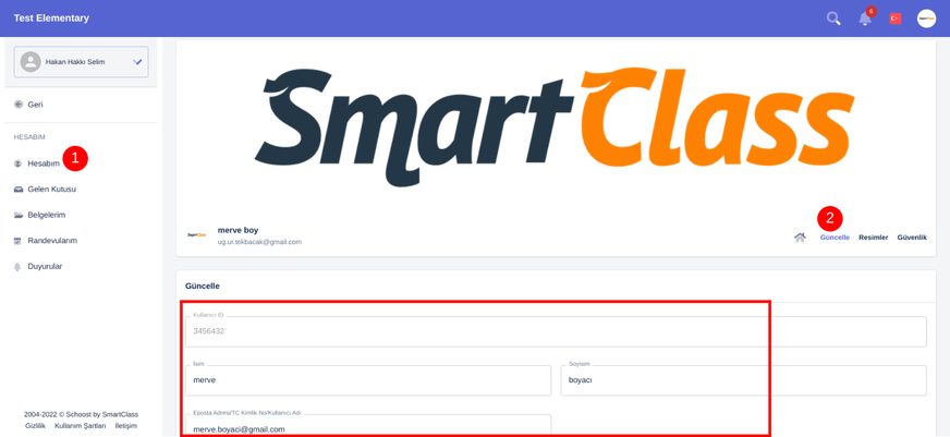- Güncelle sayfası içerisinde isim, soy isim ve mail güncellemesi gerçekleştirebilirsiniz.