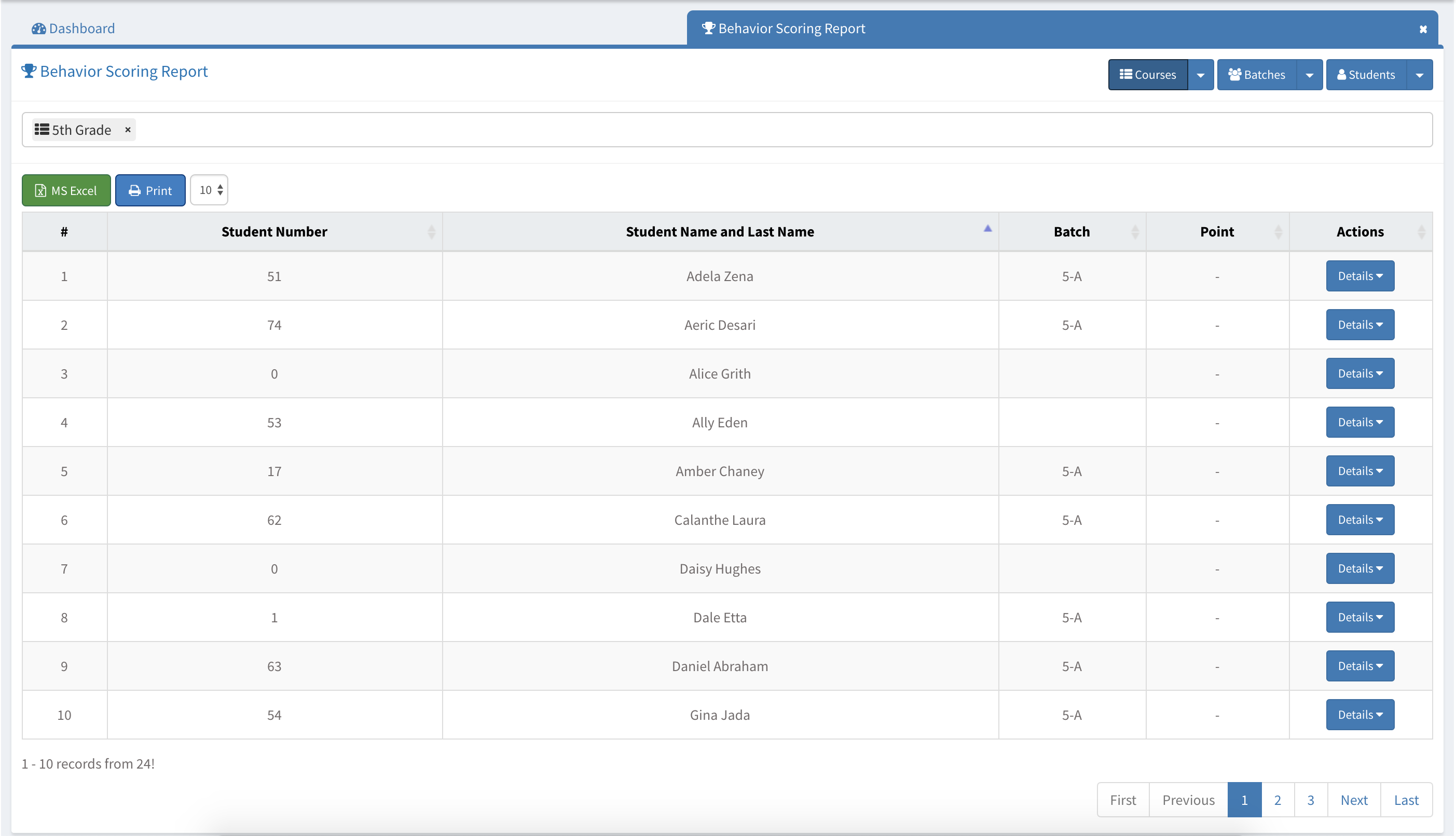 You can see the details for the students behavior assessment by filtering them out and clicking Details button.