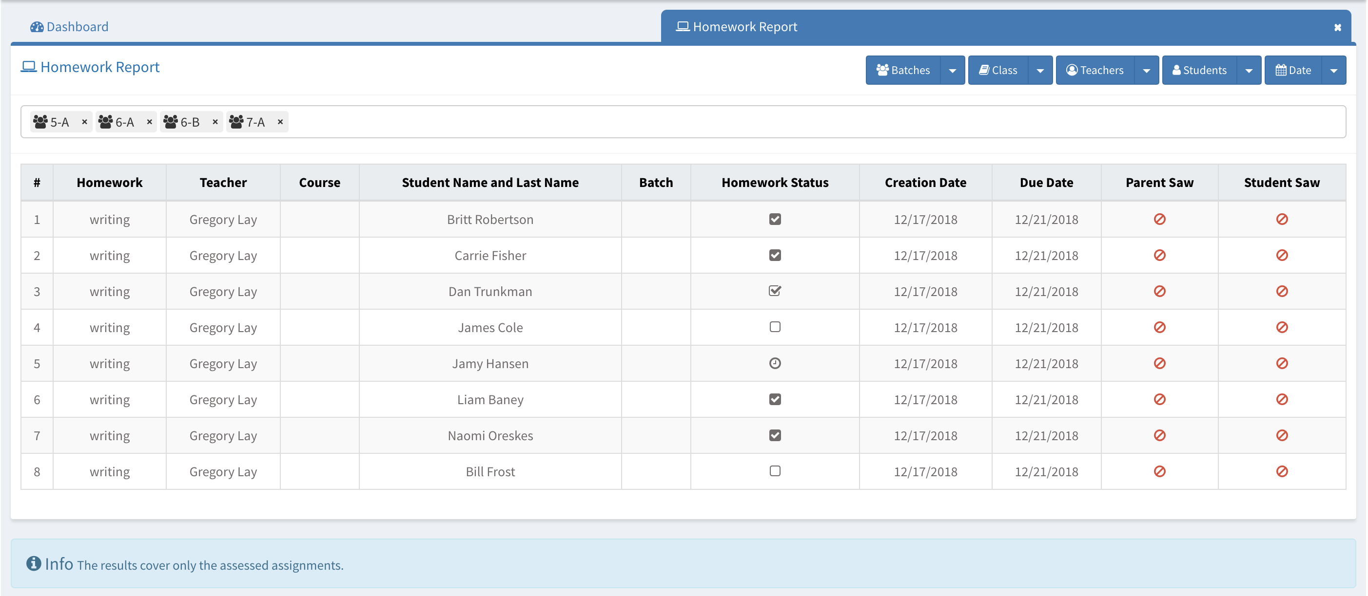 Homework reports allow you to be able to see the students homework status, dates for due and parents viewing options.