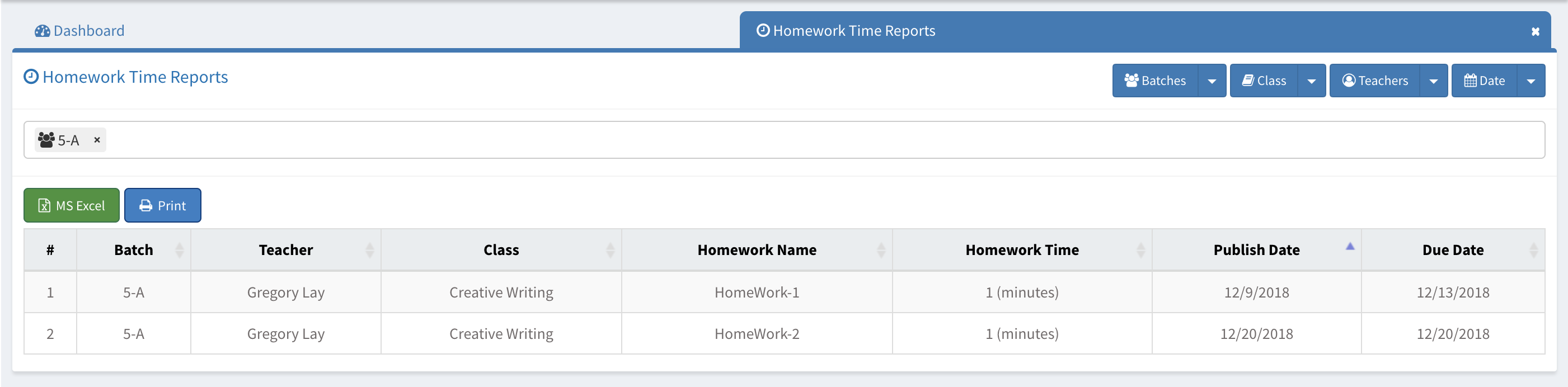 Homework time reports allow you to be able to see the students homework time status, dates for due and publish.