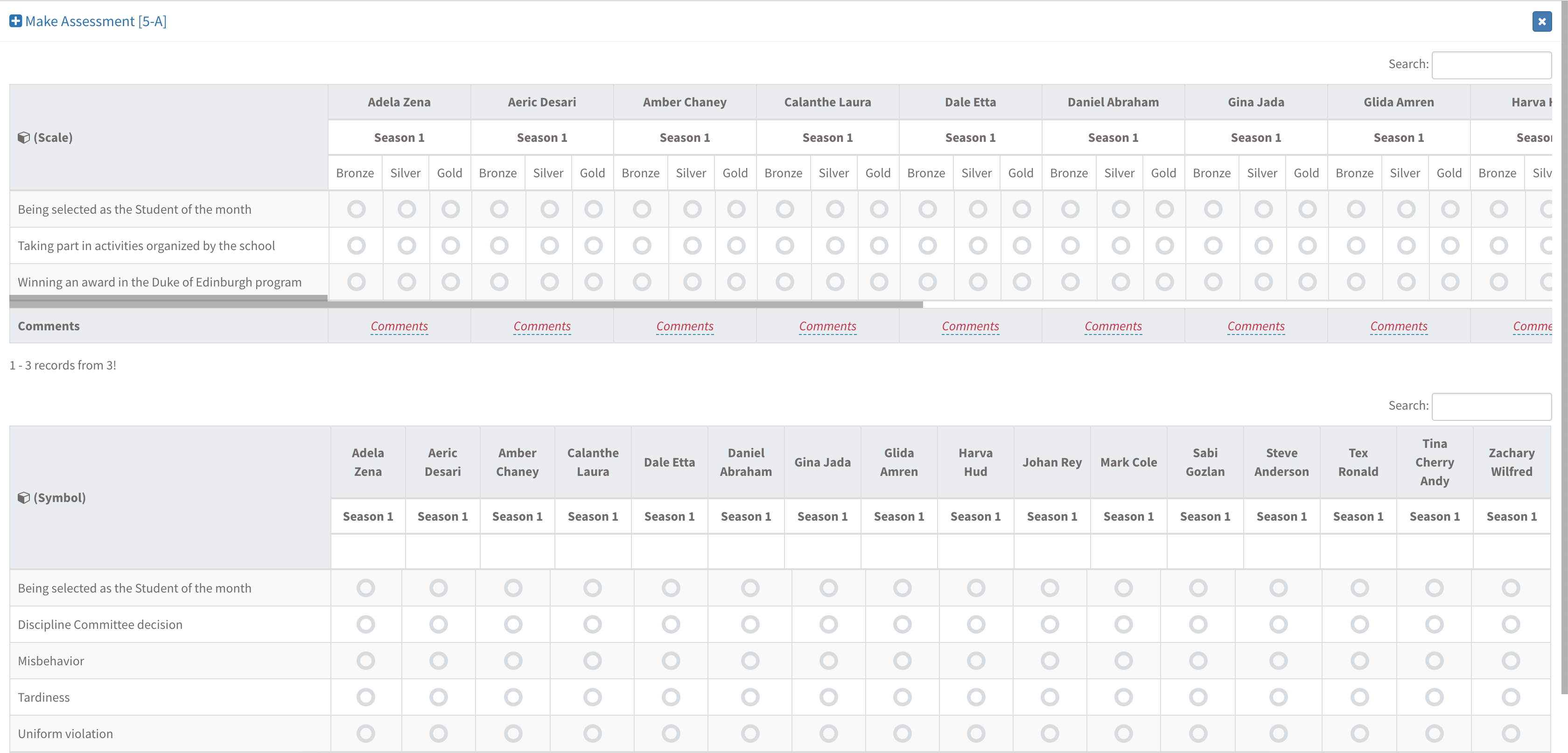 On the page that opens, you have to select the batch and student to make assessments. You can make whole batch assessments by clicking the Add Batch Assessment or you can choose to make separate assessments by choosing the student and clicking Add Student Assessment.