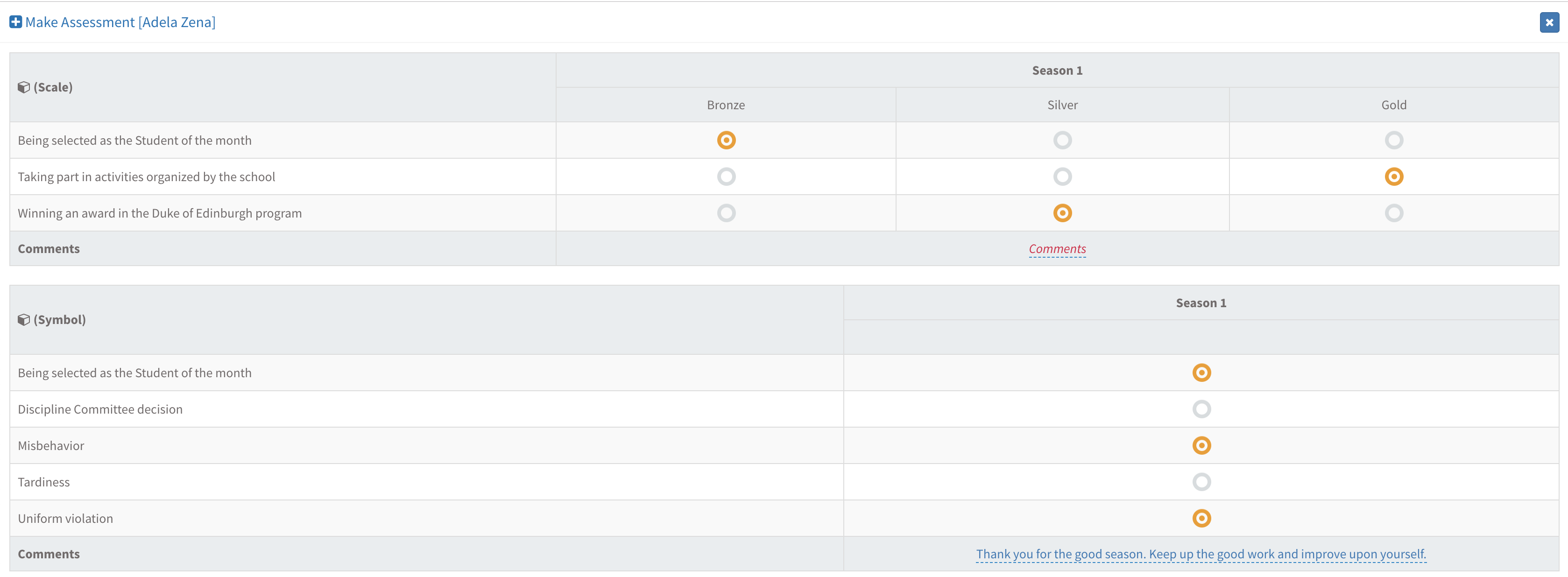 When the teachers complete their assessments on students from their student profiles with the previously created categories, you'll be able to see them in the following menus.