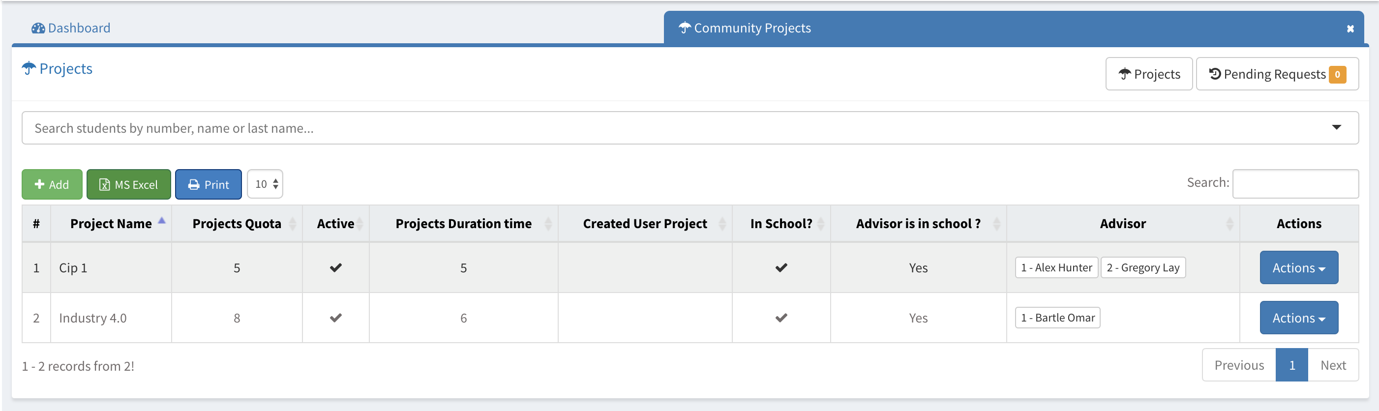 While you can add multiple advisors to a project, you can always add more students later on, see the project details anytime and export the projects list for reporting.