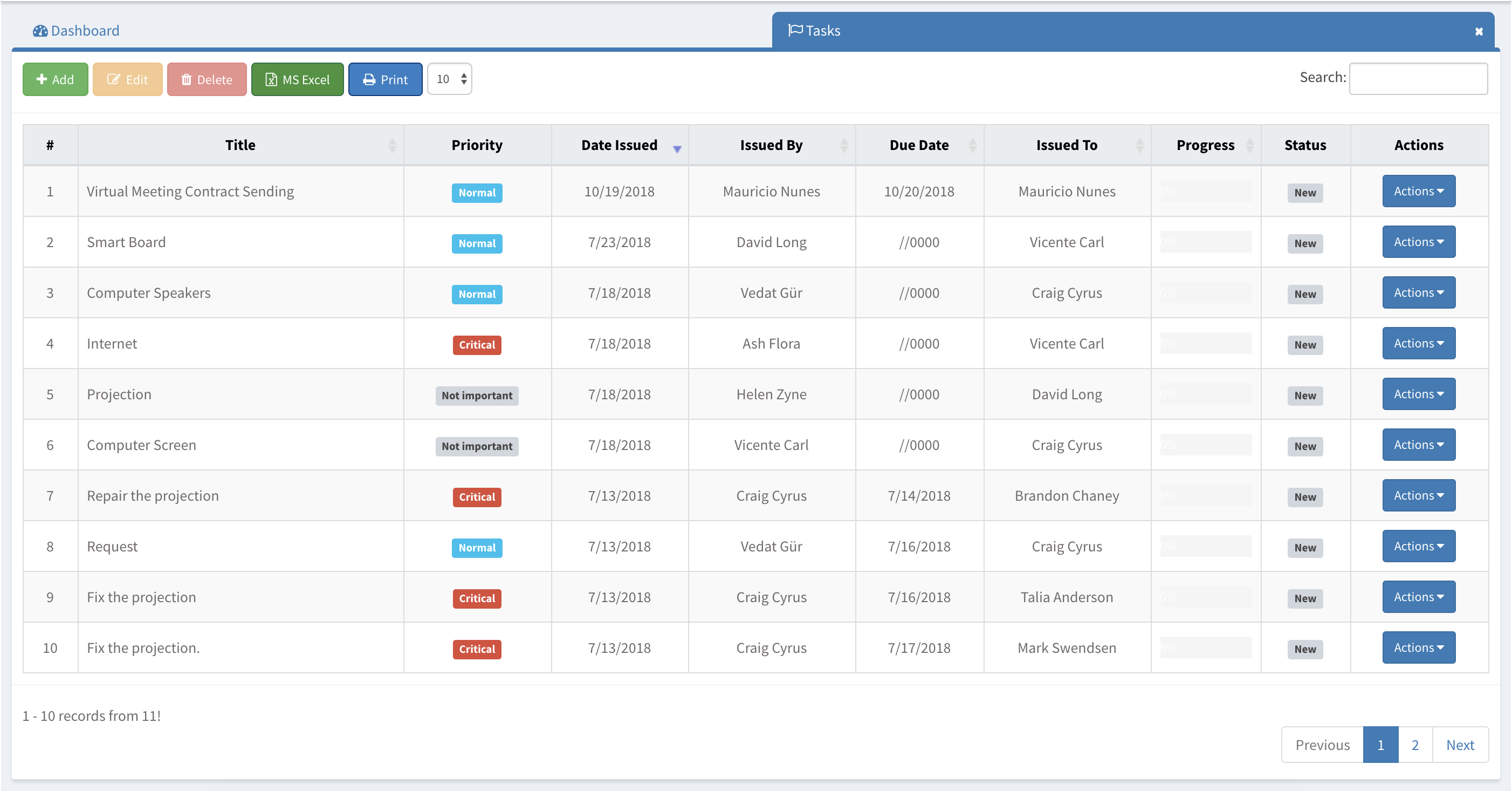 Tasks modules is integrated with users and other ERP modules to extract data to be functional. For example, when a teacher sends out a repair request, you'll be able to know from where it is coming and issued by whom with priorities.
