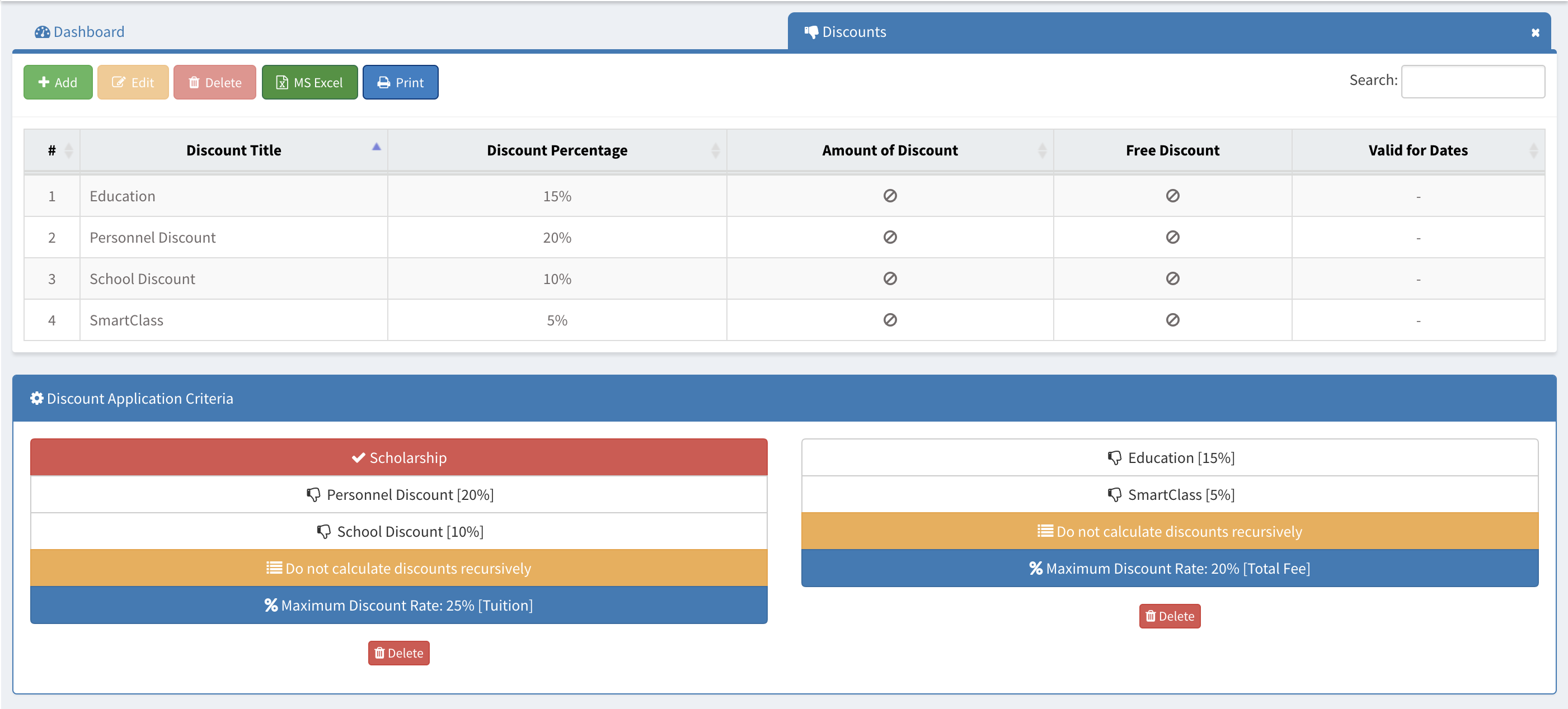 In the discounts page, you can setup your schools discount structures and discount application criteria.