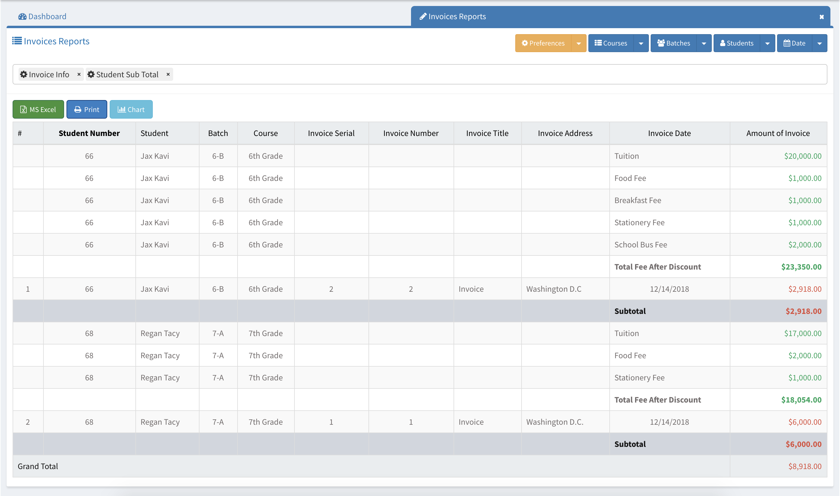 SmartClass generate the report using the latest payment details to the students profile with assigned discounts and more.