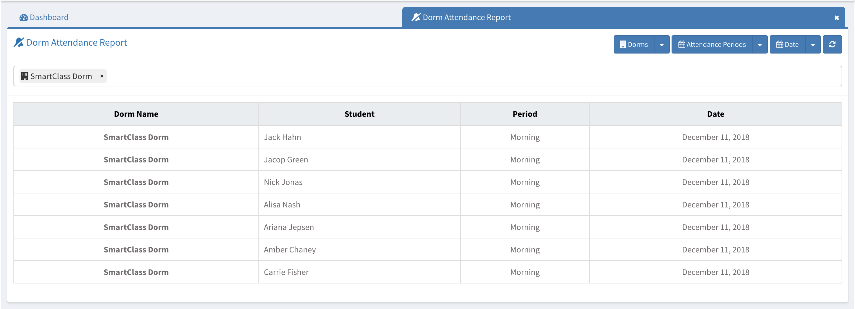 Dorm attendance reports allows administrators to see the attendances of a specific dorm or combination of dorms.