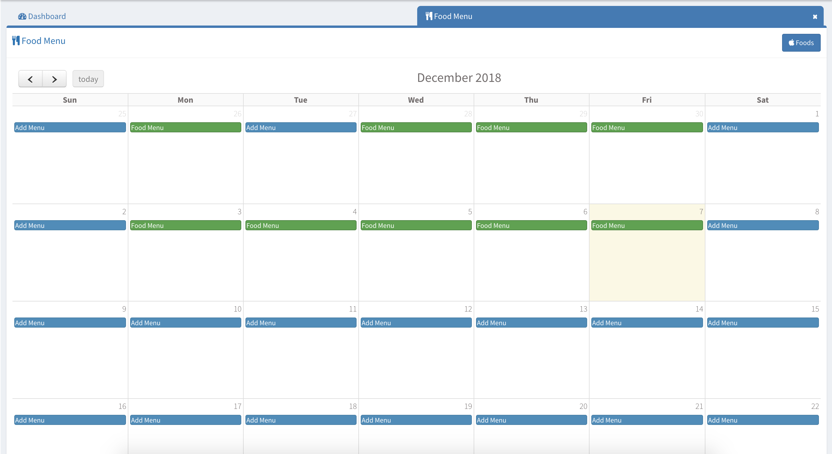 After creating the foods list, select the day you would like to build your menu in by clicking Blue colored day in the calendar.